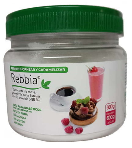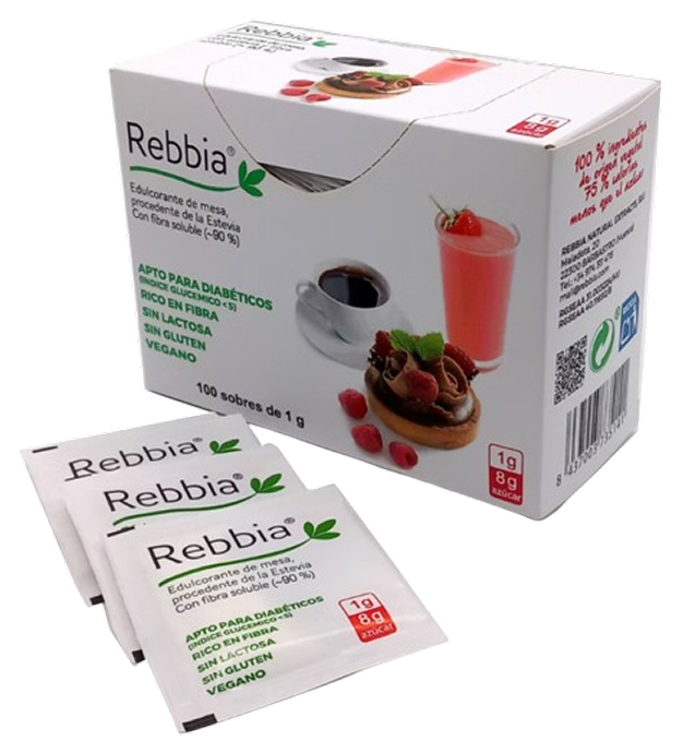 - Equivalencia frente a la Sacarosa: 1 g de Rebbia Sobres equivale a 8 g de azúcar común